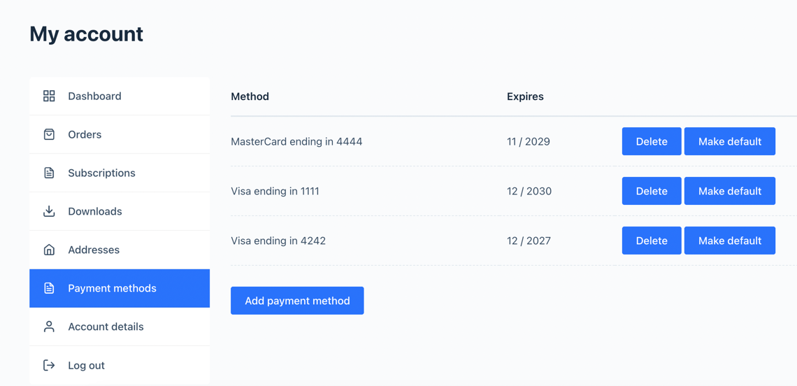 When customers have saved credit cards or other payment methods in their WooCommerce account, those payment method tokens remain fully functional after switching plugins. Customers can view their saved payment methods on the "My Account" page and use them for new purchases exactly as they did before, without needing to re-add their cards.
