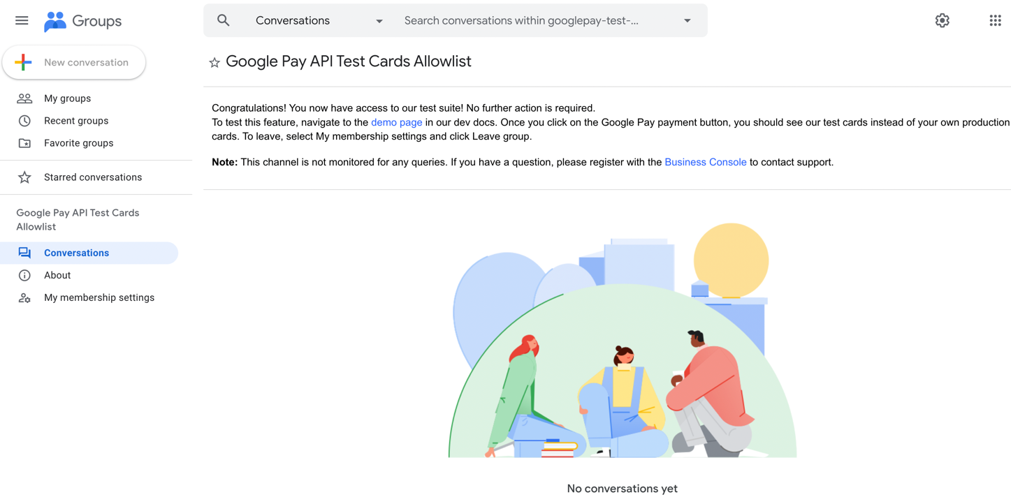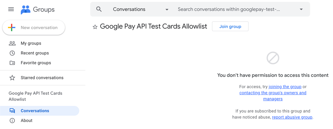 Google Groups page showing the Google Pay API Test Cards Allowlist with Join group button