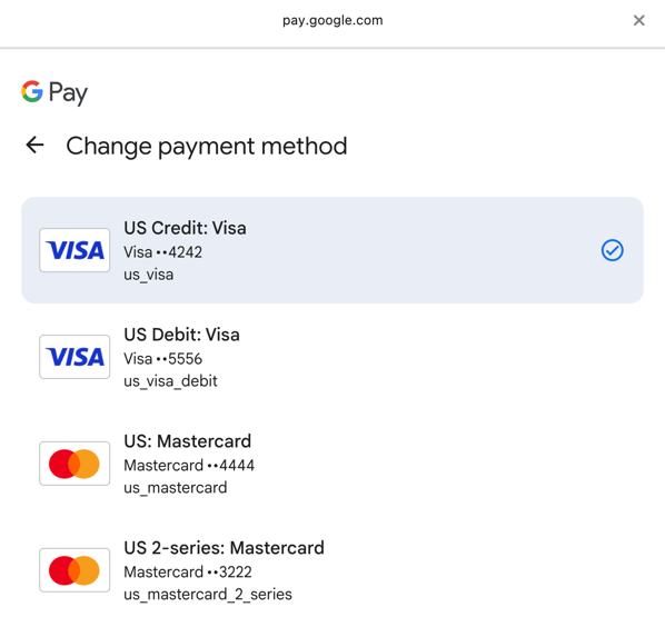 The simplest testing approach is using your own credit or debit card saved in your Google Pay wallet. With the Stripe plugin set to test mode, your card won't be charged but you'll experience the complete payment flow exactly as your customers will.