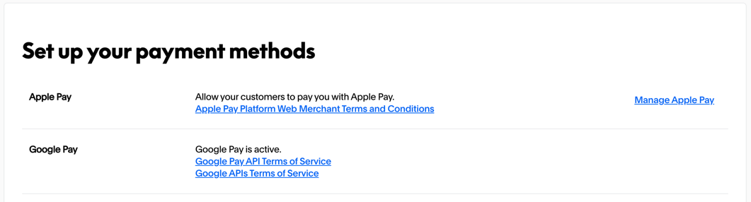 On the Payment Methods page, you'll see the available payment methods including Apple Pay and Google Pay.