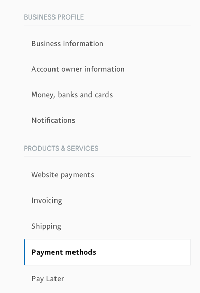 From the Settings page, look for the Payment methods option in the left-hand navigation under the "Products & Services" section.