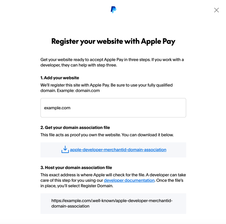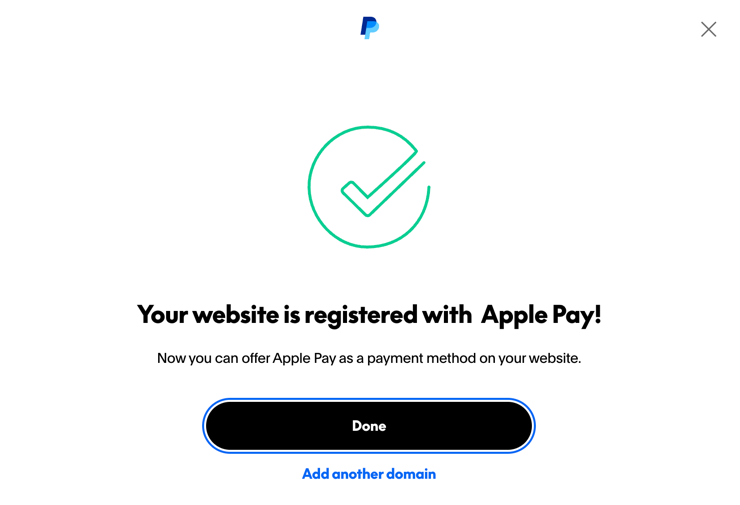 Now that the domain association file is in place, you need to register your domain with Apple Pay through your PayPal account. The steps are the same whether you're using a sandbox or production account.
