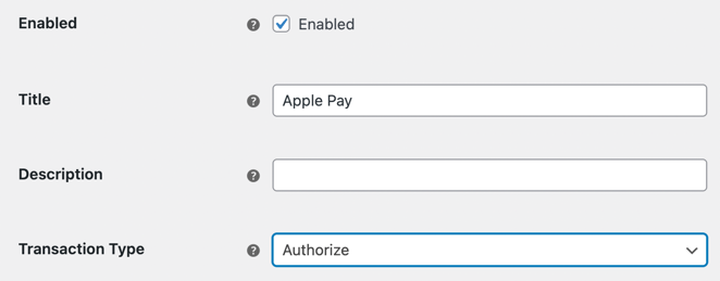 First, navigate to WooCommerce → Settings → Payments → Apple Pay in your WordPress admin. Under the Transaction Type setting, select "Authorize" from the dropdown menu. This tells the plugin to hold funds for verification rather than capturing them immediately.