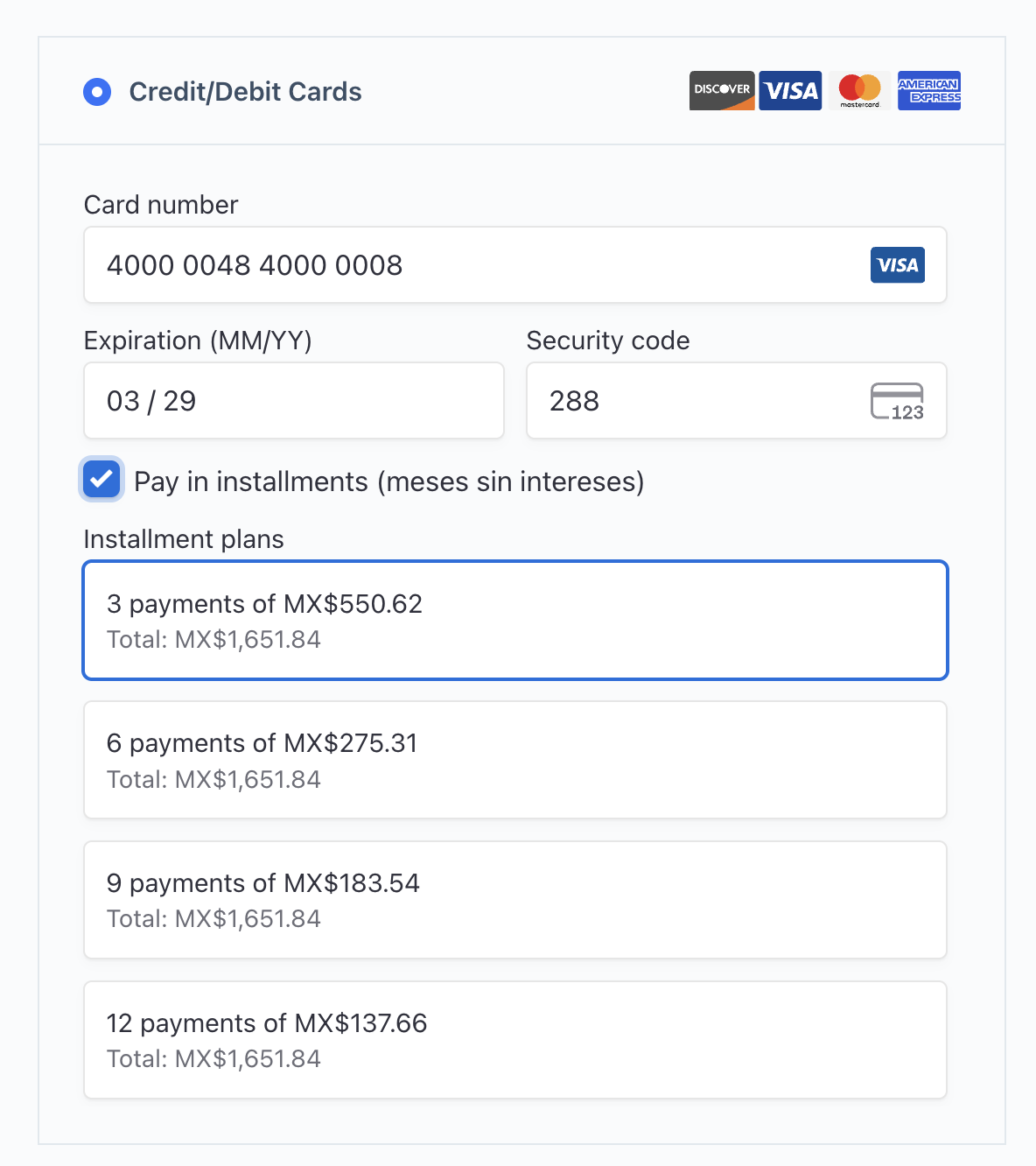 For merchants with Stripe accounts in Mexico or Brazil, installment options are now rendered natively inside Stripe's Payment Element iframe. The previous implementation used a custom HTML dropdown that the plugin maintained entirely — custom markup, CSS, and plan-fetching logic. That code has been removed.
