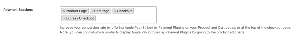 The Payment Sections setting on the Apple Pay and Google Pay settings pages has a new Checkout option. Adding Checkout to this list controls whether the payment method appears in the payment methods section of the checkout page — separate from the express checkout row at the top. Previously, these gateways would always appear in the payment methods list on the checkout shortcode with no way to disable it.