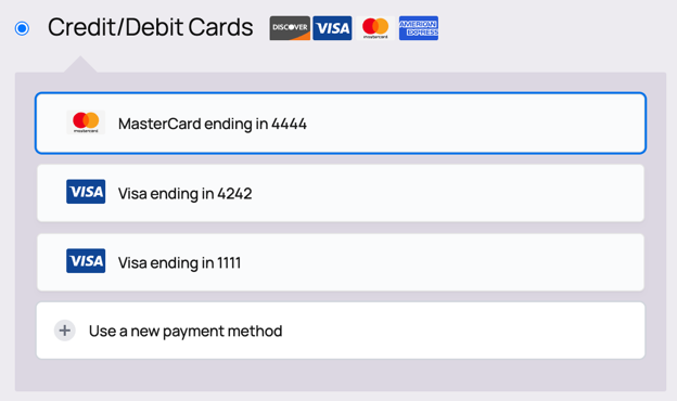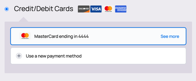 The saved payment method UI has been rebuilt. Previously, saved cards were displayed as a nested dropdown inside the Credit/Debit Cards payment method row. The new design presents each saved card as an individual row at the same level as other payment options. The most recently used card is shown by default, with a See more link to expand the full list. Selecting a card collapses the list back to show only the chosen method.
